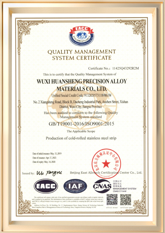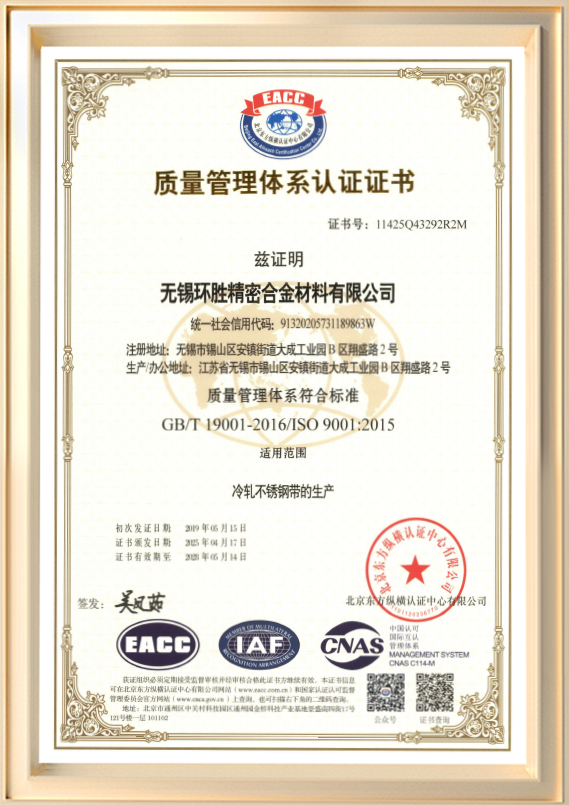 無錫環盛精密合金材料有限公司 (旧無錫環盛金属製品有限公司) は 2001 年に設立され、冷間圧延ステンレス鋼帯の研究開発と生産に従事する専門メーカーです。 同社の登録資本金は6,000万人民元、工場面積は約45,990平方メートル、年間生産能力は最大72,000トンです。 製品の厚みは0.03mm~3.0mm、最大幅は550mmまで対応可能です。